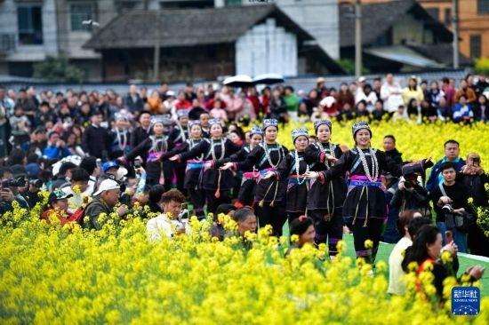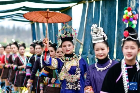 3月16日,在貴州省榕江縣車(chē)江大壩,村民們穿著民族盛裝參加花田走秀。