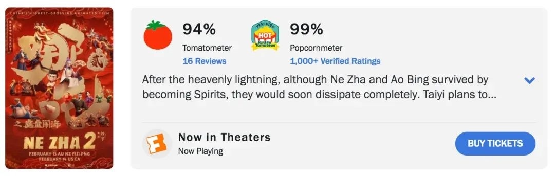 不僅打破了多項票房紀(jì)錄,《哪吒2》更以IMDb評分8.2分、爛番茄新鮮度94%、爆米花指數(shù)99%的口碑,讓世界看見中國電影的工業(yè)實力與文化魅力。