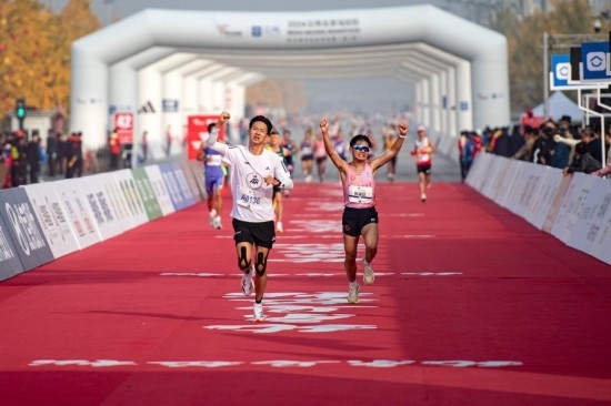 2024年11月3日,2024北京馬拉松賽暨全國(guó)馬拉松錦標(biāo)賽(第3站)在京舉行。參賽選手沖向位于奧林匹克公園的終點(diǎn)線。新華社記者 陳鐘昊攝