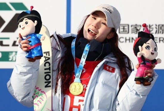 劉夢婷的雪板上有一個“谷”字,她解釋說這是谷愛凌同款定制雪板。“我很喜歡她的風(fēng)格,把她作為我的榜樣,激勵我進(jìn)步?!?/p>