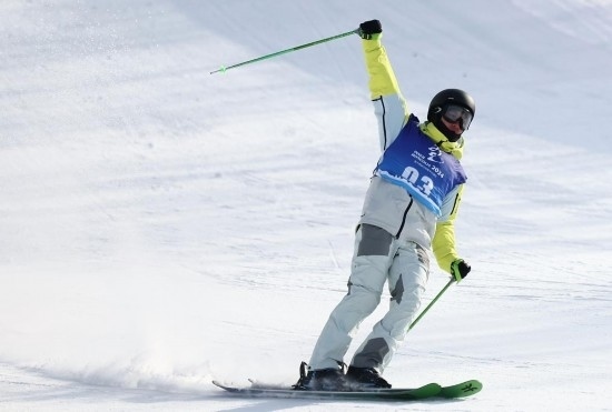 2月17日,內(nèi)蒙古隊選手楊昊在比賽中慶祝,他以174.75分的成績獲得冠軍。新華社記者 王楷焱 攝