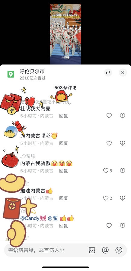 網(wǎng)友紛紛表示:“為內(nèi)蒙古喝彩”“內(nèi)蒙古我驕傲”“這個(gè)地方挺漂亮,祝運(yùn)動(dòng)會(huì)圓滿成功”等。