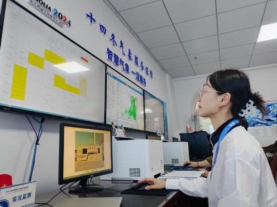氣象服務(wù)團(tuán)隊負(fù)責(zé)人王穎正在分析研判天氣情況。新華社記者 張武岳 攝