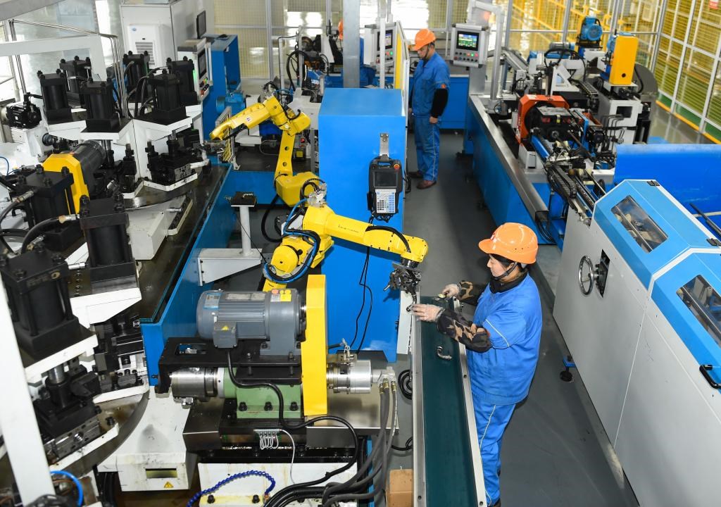 2月14日,浙江省湖州市吳興區(qū)的一家企業(yè),工作人員和智能機(jī)器人協(xié)作生產(chǎn)不銹鋼管件。新華社記者 翁忻旸 攝