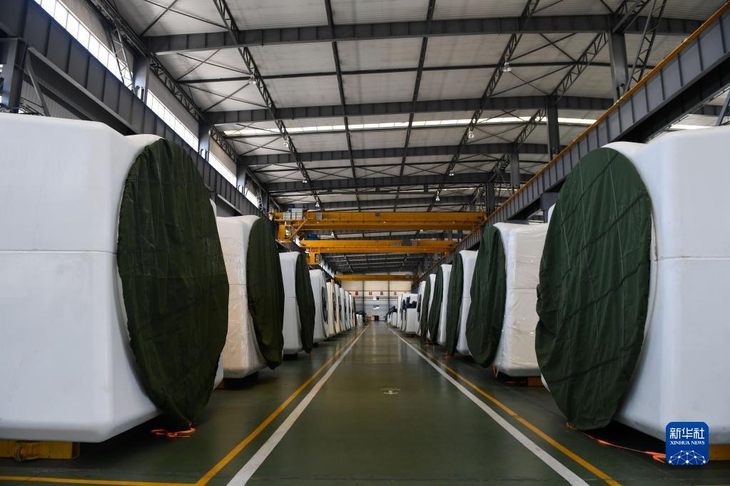 這是在內(nèi)蒙古鄂爾多斯市一家能源裝備有限公司生產(chǎn)車(chē)間拍攝的準(zhǔn)備出售的風(fēng)電機(jī)(2018年4月18日攝)。新華社記者 劉磊 攝
