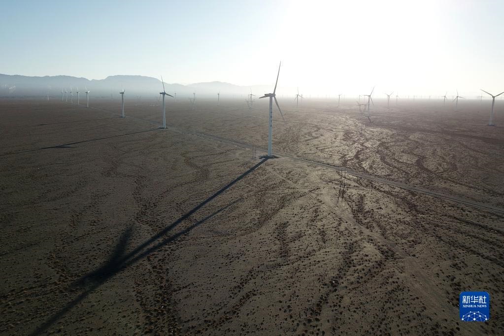 這是2021年12月8日拍攝的中節(jié)能(甘肅)風(fēng)力發(fā)電有限公司玉門(mén)昌馬風(fēng)電場(chǎng)的風(fēng)機(jī)(無(wú)人機(jī)照片)。新華社記者 范培珅 攝