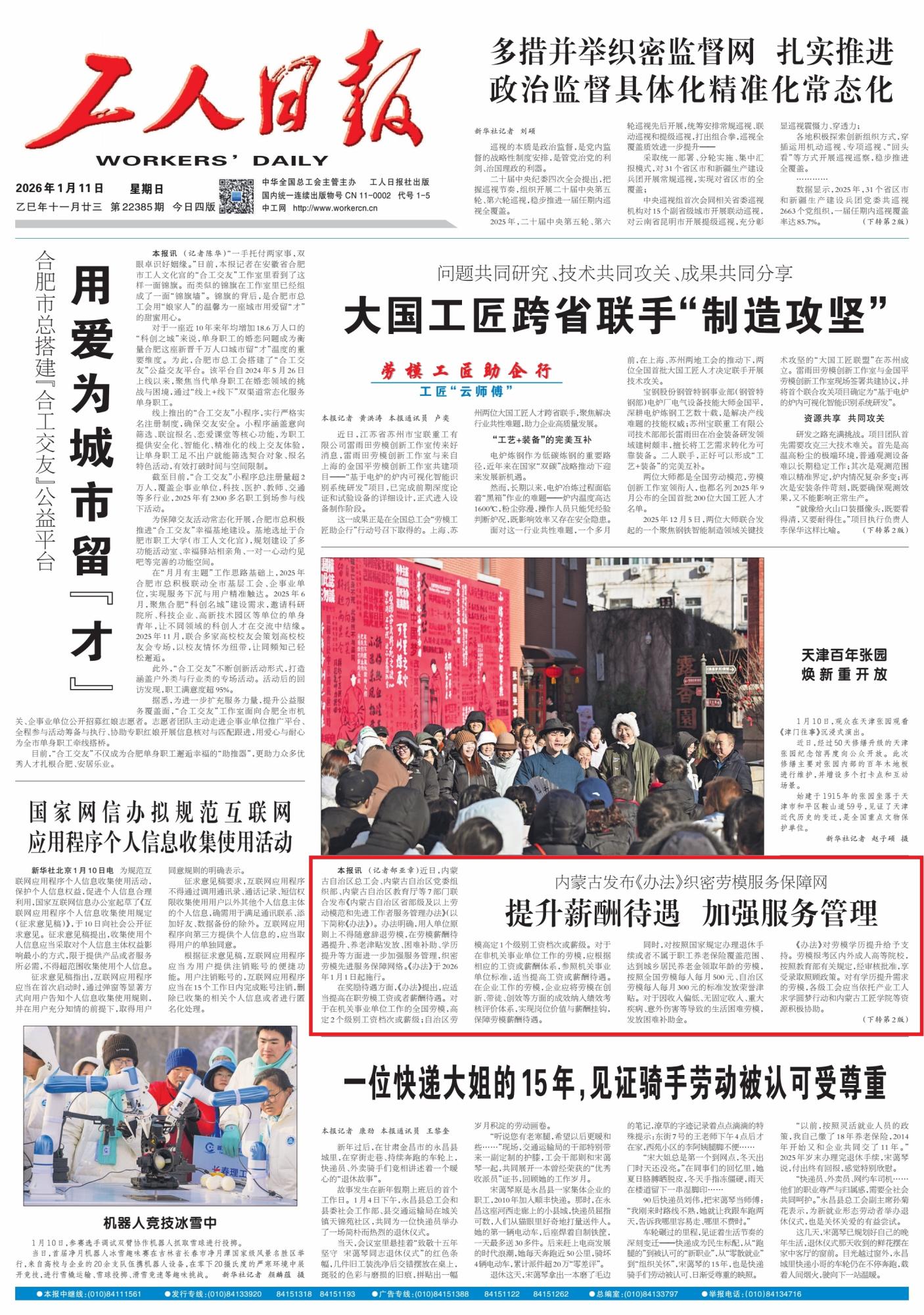 2026年1月11日,《工人日報》頭版刊發(fā)了《提升薪酬待遇 加強服務(wù)管理》的文章,報道了2026年1月1日起,內(nèi)蒙古7部門聯(lián)合施行省部級及以上勞模服務(wù)管理辦法,明確用人單位原則上不得隨意辭退勞模,從薪酬提升、退休榮譽津貼發(fā)放、困難補助、學(xué)歷提升支持、失業(yè)優(yōu)先再就業(yè)及住房優(yōu)先保障等方面強化服務(wù)保障,并建立屬地管理及違法違紀等情形的退出機制。