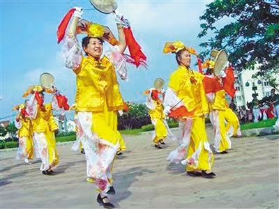 這是呼和浩特市新城區(qū)文化館老年滿族太平鼓舞隊(duì)表演時(shí)的一個(gè)場(chǎng)景。