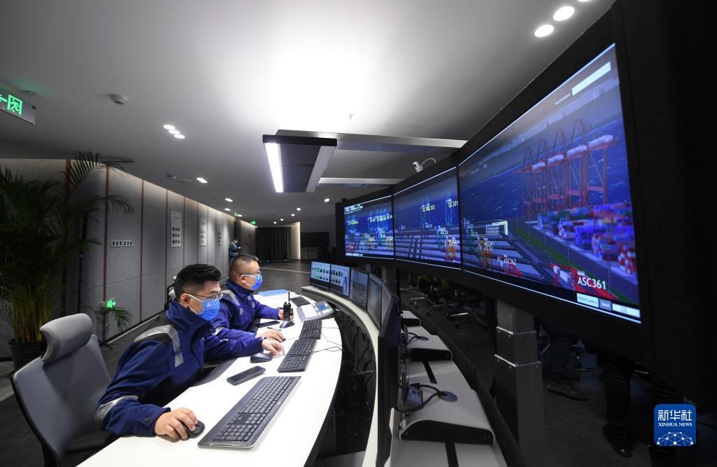 工作人員在天津港北疆港區(qū)C段智能化集裝箱碼頭智控中心內(nèi)監(jiān)控碼頭作業(yè)狀態(tài)(2021年10月17日攝)。新華社記者 趙子碩 攝