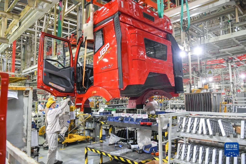 工人在位于吉林省長(zhǎng)春市的一汽解放總裝車間裝配車輛(2021年7月7日攝)。新華社記者 張楠 攝