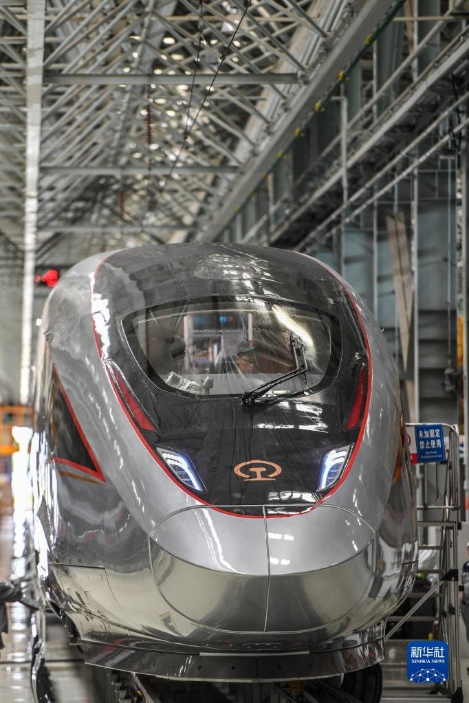 2021年6月15日在中車長(zhǎng)客高速動(dòng)車組制造中心拍攝的復(fù)興號(hào)智能動(dòng)車組。新華社記者 張楠 攝