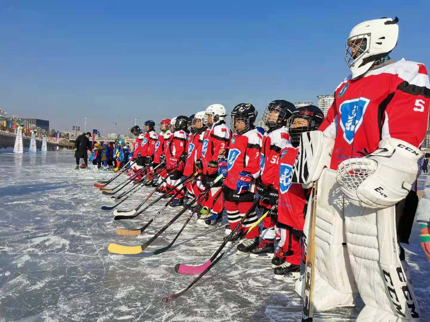 冰面上,身著滑冰服的小朋友們蓄勢(shì)以待。