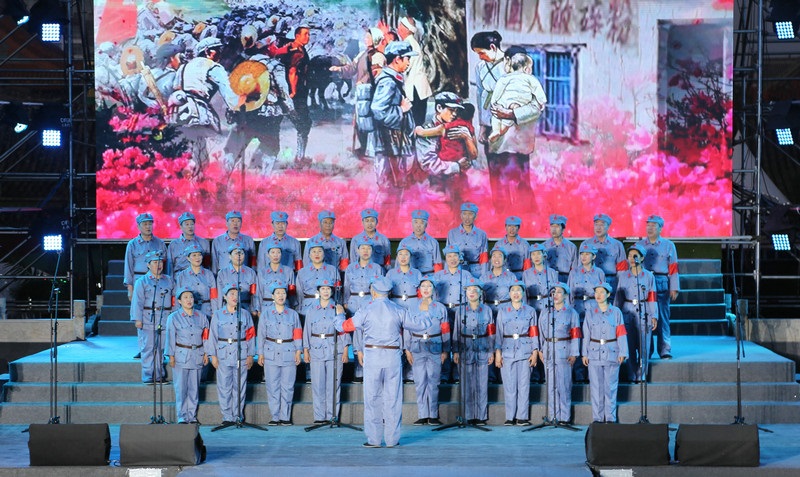 “唱支山歌給黨聽,我把黨來比母親,母親只生了我的身,黨的光輝照我心......”雨后的舞臺煥然一新,一首首耳熟能詳的革命歌曲,把人們的思緒瞬間拉回歷史的長河,手中揮舞著一面面鮮艷的五星紅旗,點亮了整個夜晚。